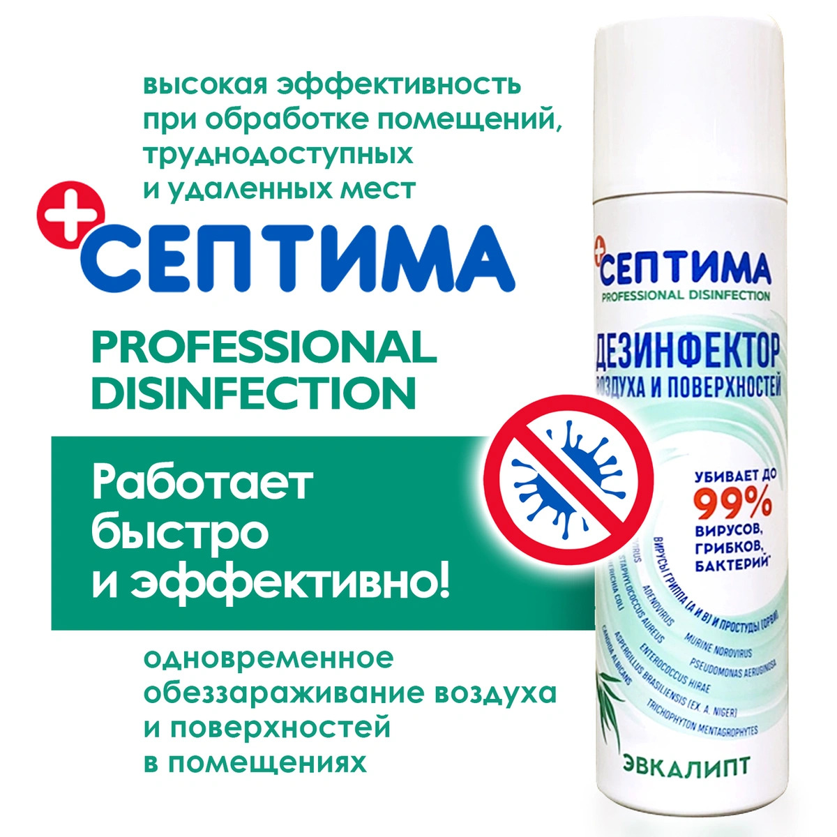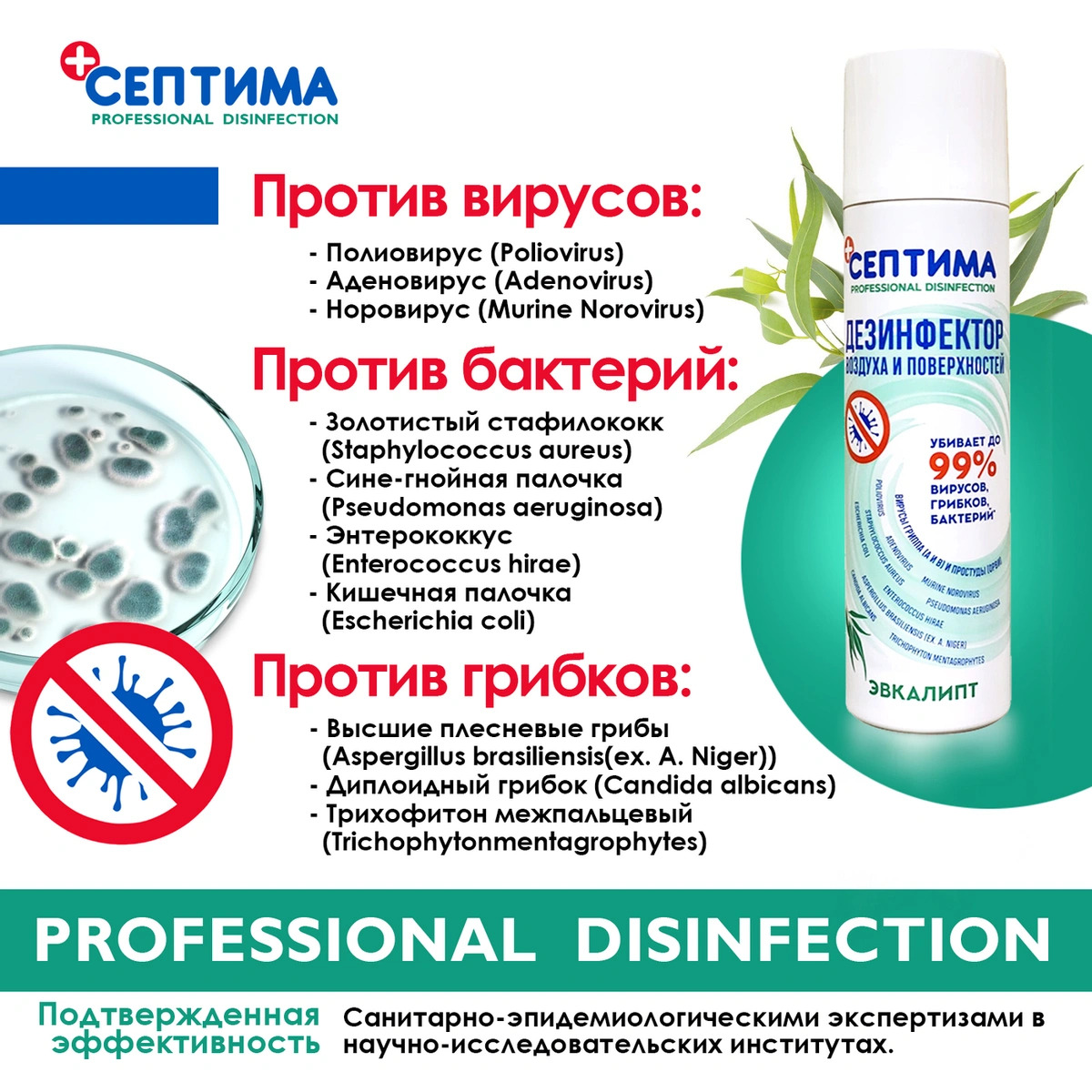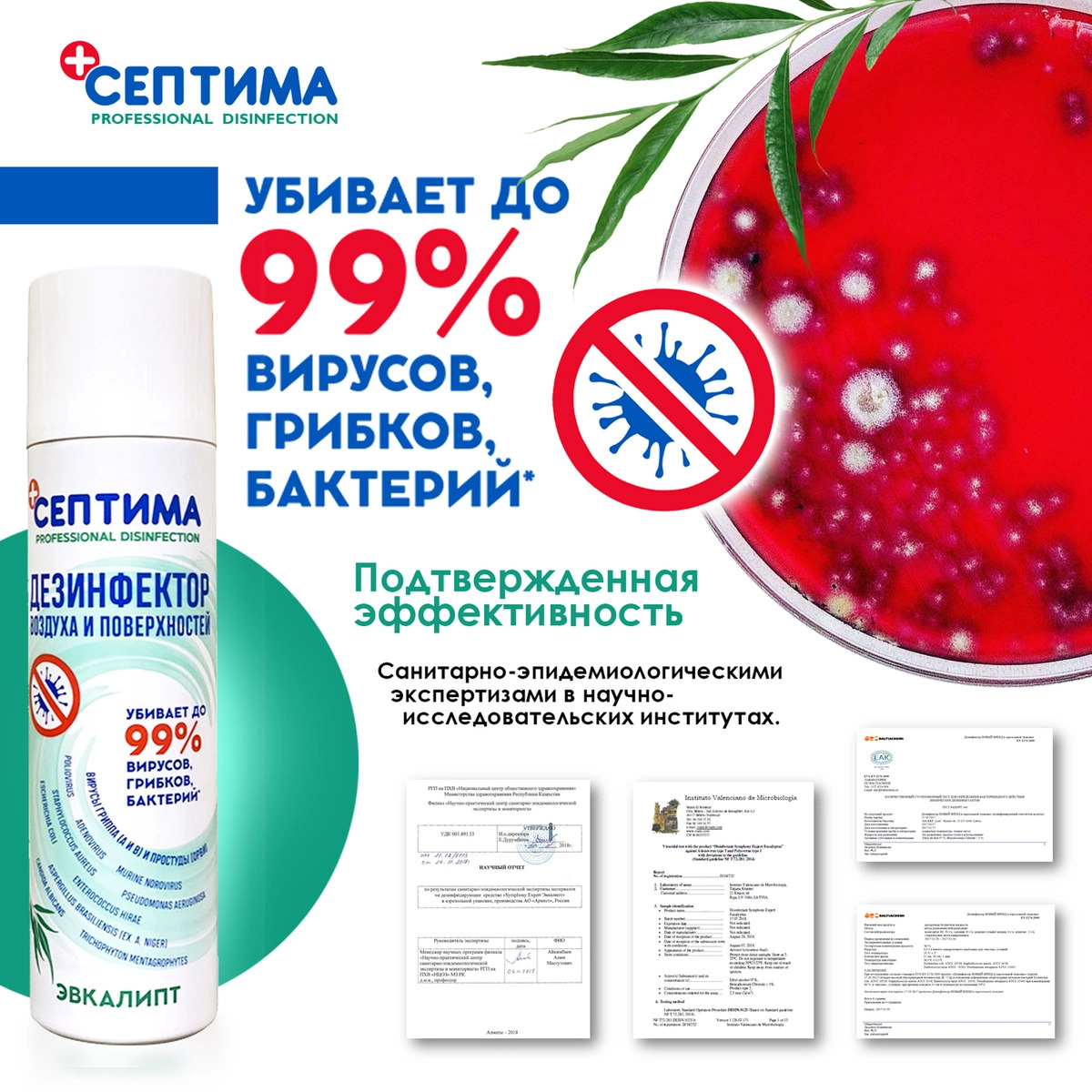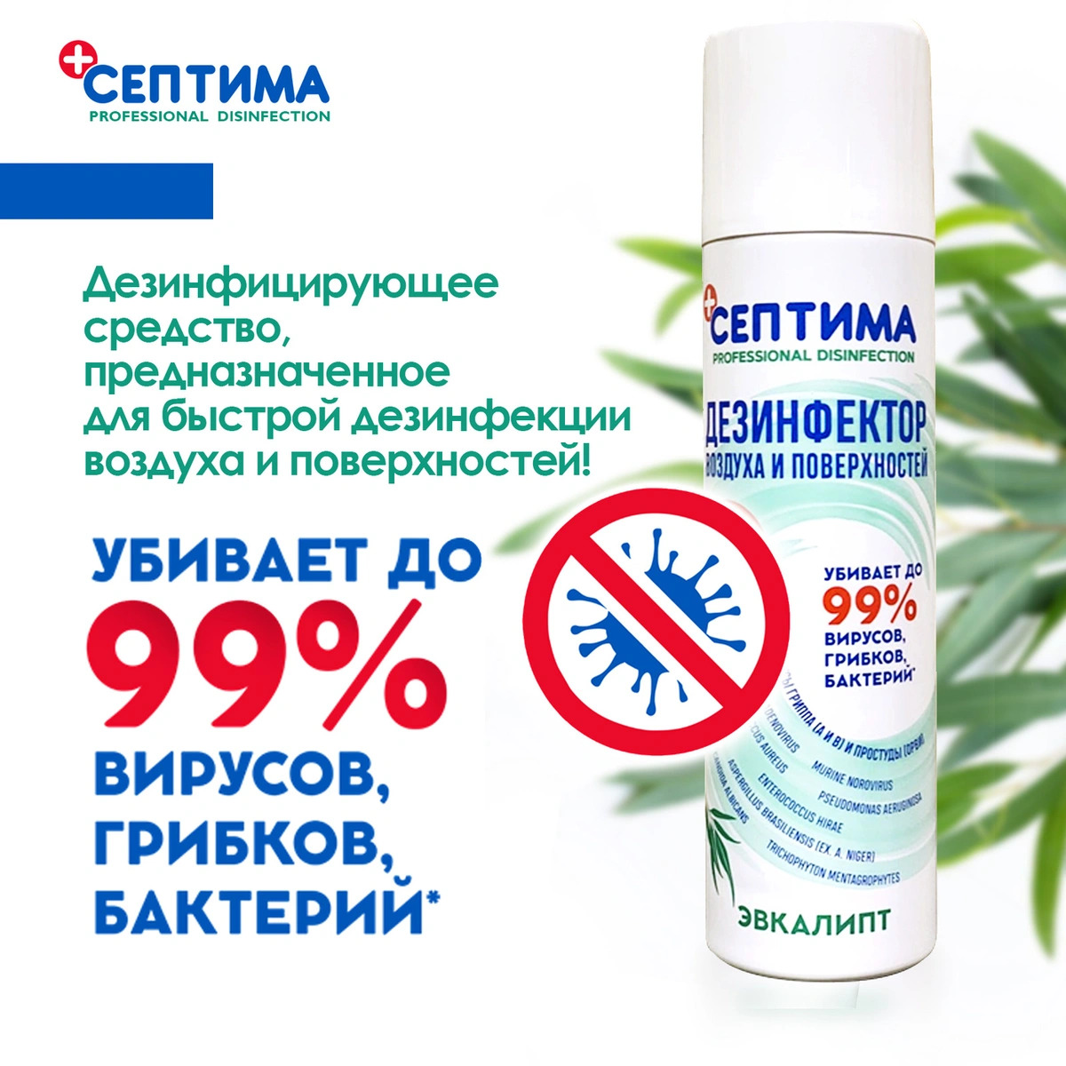 Дезинфектор для воздуха и поверхностей. Дезинфектор СЕПТИМА - дезинфицирующее средство для помещений, предназначенное для быстрой дезинфекции воздуха и поверхностей от вирусов, бактерий и грибков. Многофункциональный продукт, не имеющий прямых аналогов на российском рынке! Убивает до 99% вирусов, бактерий и грибков.