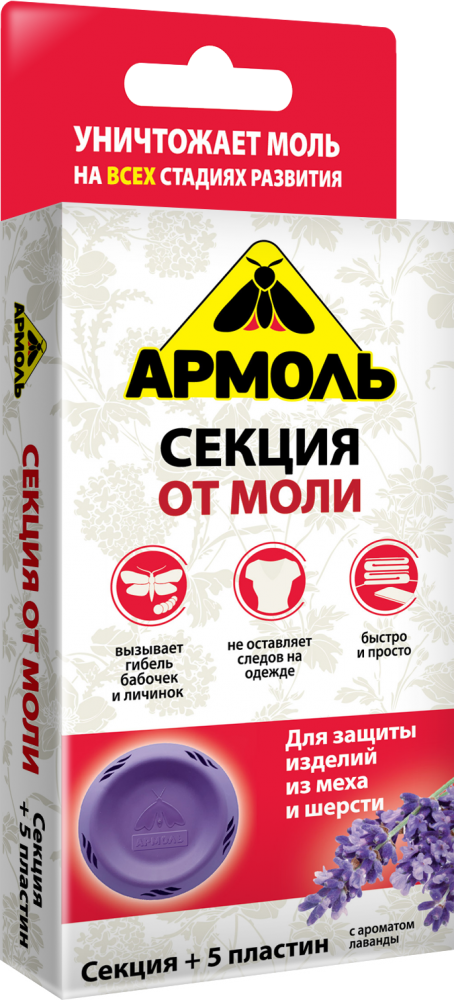 «Армоль» – линия средств для уничтожения моли на всех стадиях ее развития. Специализированная марка предлагает доступные по цене средства, которые обеспечивают эффективную защиту вещей от повреждения молью. Формула «2в1» гарантированно уничтожает моль на всех стадиях развития, а ароматы лаванды и цитруса дополнительно отпугивают моль.