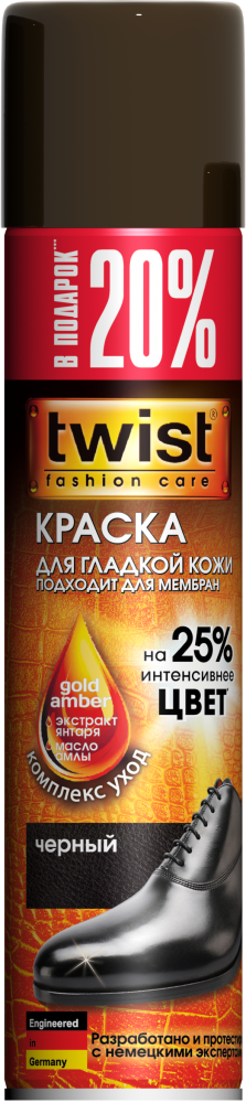 Twist – современный бренд косметических средств для ежедневного ухода за обувью, одеждой и аксессуарами. С Twist каждая женщина, мужчина и ребенок могут носить модную и красивую обувь в любой ситуации. Средства Twist обогащены уникальными активными натуральными компонентами на основе золотистого янтаря (Gold Amber). Gold Amber в составе способствует: • Восстановлению и смягчению кожи. • Придает ей стойкий цвет и блеск. • Защищает обувь от негативного воздействия окружающей среды. • Предотвращает появление пятен от воды, соли и снега.